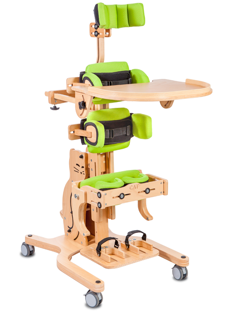 Pionizator KOTEK II Invento™ umożliwia indywidualne podejście do potrzeb dziecka i jego rodziny. Odpowiednia konfiguracja urządzenia pozwala na pionizację tyłem lub przodem w zależności od dysfunkcji narządu ruchu i wskazań medycznych/terapeutycznych. Dobór właściwego dla dziecka sposobu pionizacji, dostarczy pozytywnych bodźców niezbędnych do dalszego rozwoju. Płynna regulacja kąta nachylenia (od 0° do 90°), pozwala na zmianę pozycji z leżącej do stojącej. Co ważne, pionizator posiada zabezpieczenie uniemożliwiające przypadkową jej zmianę. Znacznym ułatwieniem podczas użytkowania jest podziałka wskazująca kąt pochylenia pionizatora. Ułatwia ona codzienny proces rehabilitacji. Ergonomiczny system pelot i pasów bezpieczeństwa sprawia, że dziecko czuje się w KOTKU II Invento™ bardzo pewnie i bezpiecznie. Dzięki temu ma możliwość spożywania posiłków, zabawy, nauki oraz terapii w najlepszej dla siebie pozycji.