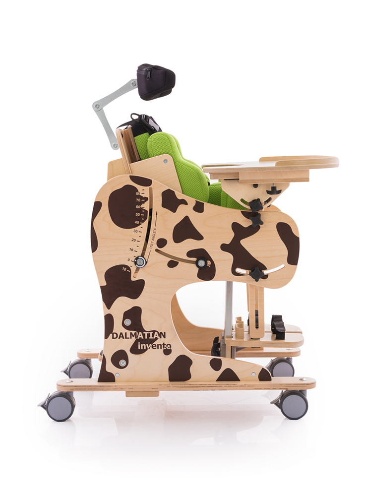 Urządzenie wielofunkcyjne DALMATYŃCZYK Invento™ ma szerokie zastosowanie w procesie rehabilitacji. Polecane jest zarówno dla dzieci, jak i młodzieży. Pełni rolę fotelika rehabilitacyjnego, pionizatora statycznego oraz leżanki, co jest niewątpliwie jego główną zaletą. Oszczędność miejsca i wielofunkcyjność to jego główne cechy. Używany zarówno we wstępnej adaptacji użytkownika do pozycji siedzącej, jak i w dalszym złożonym procesie rehabilitacji. Dzięki sprężynie gazowej możemy płynnie pionizować użytkowników z pozycji leżącej do stojącej. Co więcej, możemy to zrobić nie wyjmując ich z pionizatora. Taką możliwość szczególnie docenią terapeuci oraz opiekunowie. Rozbudowany system pelot i pasów bezpieczeństwa w DALMATYŃCZYKu Invento™ sprawia, że dziecko czuje się w nim bardzo pewnie i bezpiecznie. Zadbaliśmy jednocześnie o maksymalną wygodę i swobodę ruchów. Kamizelka bezpieczeństwa i pas biodrowy wyposażone zostały w innowacyjny system Chwyć i pociągnij™. Umożliwiają one błyskawiczne i precyzyjne zabezpieczenie dziecka w urządzeniu, a w razie potrzeby na natychmiastowe wyjęcie go z urządzenia.