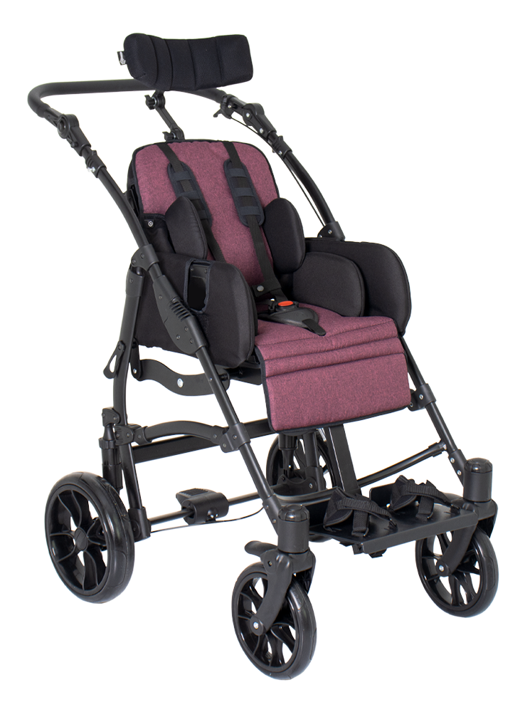 AURA® to wózek specjalny dedykowany dzieciom, których dysfunkcje ruchowe uniemożliwiają samodzielne poruszanie się. Posiada on wiele użytecznych rozwiązań, które ułatwiają opiekę nad użytkownikiem zapewniając mu bezpieczeństwo i komfort. Regulacja wysokości oparcia, głębokości siedziska oraz długości podnóżka sprawiają, że wózek rośnie wraz z dzieckiem. Rozbudowany system pelot tułowia oraz bioder zapewnia właściwą stabilizację boczną. W połączeniu z 5-punktowymi pasami istotnie wpływa na utrzymanie poprawnej pozycji siedzącej. Oparcie wyposażone zostało w zagłówek, który można łatwo dopasować do kształtu głowy, zabezpieczając ją przed opadaniem na bok. Funkcja kubełkowa wraz z odchylanym oparciem i regulowanym kątem nachylenia podnóżka, łatwo i szybko zmienią wózek w leżankę. Pozwala to na zmianę pozycji z siedzącej na leżącą zależnie od aktualnego stanu zdrowia i samopoczucia. Przekładane siedzisko umożliwia jazdę przodem lub tyłem do kierunku jazdy. Dziecko może eksplorować otoczenie podczas spacerów lub w razie potrzeby mieć bezpośredni kontakt wzrokowy z opiekunem, co zwiększa jego poczucie bezpieczeństwa.