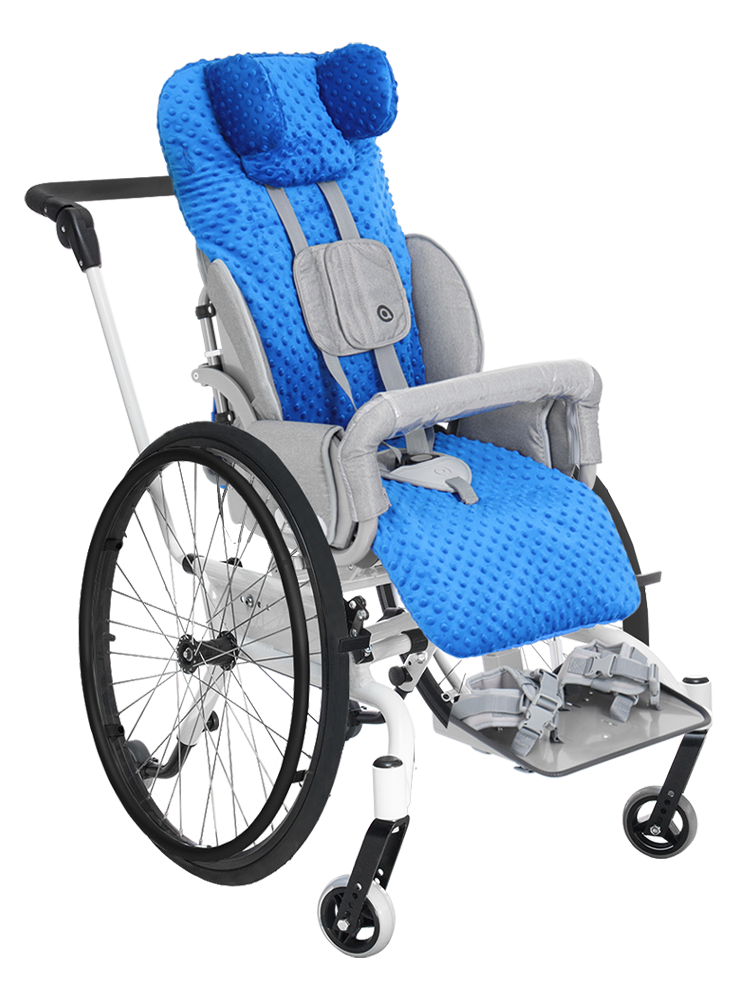 Wózek został wyposażony w bawełniano-zmywalną, dwustronną nakładkę COMFORT w jednym z 5 kolorów do wyboru. |