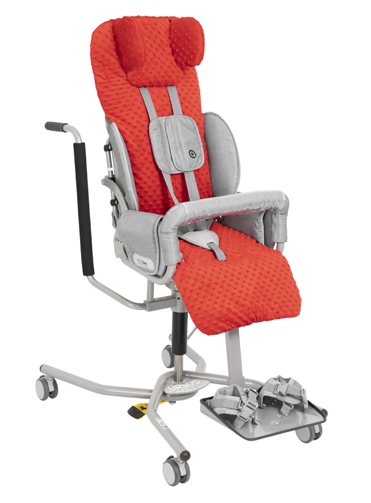 Wózek specjalny inwalidzki pokojowy URSUS HOME™ to doskonałe rozwiązanie do codziennej rehabilitacji dzieci z dysfunkcjami narządu ruchu. Stabilna konstrukcja wózka oraz rozbudowany system pelot i pasów bezpieczeństwa sprawiają, że dziecko czuje się w URSUSie HOME™ bardzo pewnie i bezpiecznie. Dzięki temu mały użytkownik ma możliwość spożywania posiłków, zabawy, nauki oraz terapii w pozycji siedzącej lub półleżącej. Opiekunowie mogą łatwo i płynnie zmieniać wysokość siedziska. URSUS HOME™ posiada wytrzymałą tapicerkę HYDRO™ w kolorze szarym. Dla zwiększenia komfortu wózek został wyposażony w bawełniano-zmywalną, dwustronną nakładkę COMFORT w jednym z 5 kolorów do wyboru. Dzięki regulacji oparcia, siedziska oraz podnóżka dziecko może odpocząć w pozycji leżącej. Szczególną zaletą, którą docenią terapeuci jest płynna regulacja funkcji kubełkowej. Bogate wyposażenie i szeroki zakres regulacji pozwala na odpowiednie dopasowanie wózka do potrzeb i dysfunkcji dziecka. Kompaktowa budowa i małe gabaryty pozwalają na użytkowanie URSUS HOME™ w małych i ciasnych pomieszczeniach. Baza dostępna w jednym uniwersalnym rozmiarze Dzięki systemowi ClickClack™ siedzisko możemy szybko, sprawnie i bez dodatkowych adapterów wpiąć do innych baz znajdujących się w naszej ofercie (URSUS™, URSUS HOME™, URSUS ACTIVE™).