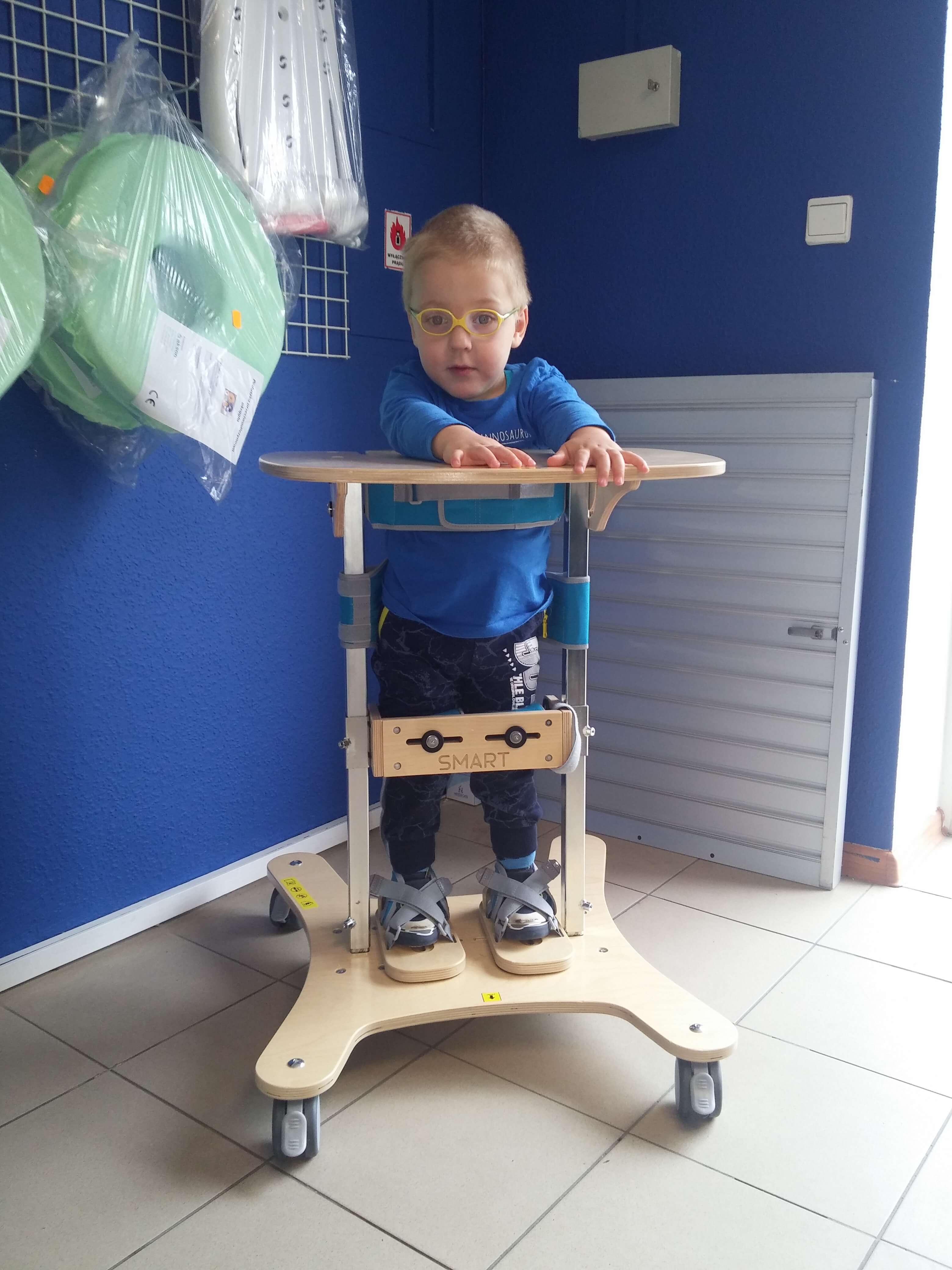 Wiemy jak ważne jest to, aby Tymek był pionizowany. Pozycja pionowa to lepsze funkcjonowanie wielu narządów i pozytywny wpływ na postęp rehabilitacji. Tu także z pomocą przyszedł nam sprzęt z Akces-Med. Korzystamy z pionizatora statycznego Smart w rozmiarze drugim. Tymuś bardzo fajnie funkcjonuje podczas stania w urządzeniu. Smart w zależności od wysokości ustawienia stolika wraz z obejmą piersiową daje mu pełną stabilizację tułowia, albo jeśli opuścimy stolik nieco niżej, pozwala na pracę mięśni tułowia. Prosty blat stołu to pole do popisu dla synka, który bardzo lubi bawić się na mim. W Smarcie także nie ma obawy, że Tymek za chwilę z niego wyrośnie, ponieważ ma on regulację wysokości.