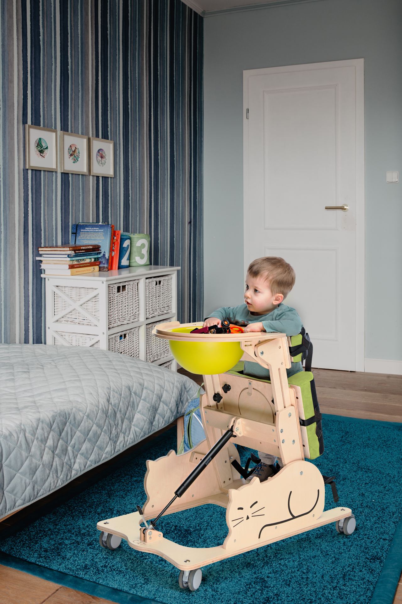Pionizator KOTEK I™ powstał z myślą o przedniej pionizacji dzieci, u których dysfunkcje narządu ruchu uniemożliwiają samodzielne przyjmowanie pozycji stojącej. Pionizacja przyczynia się do zdobywania przez dziecko nowych doświadczeń płynących z obserwacji najbliższego otoczenia oraz stymuluje jego rozwój psychofizyczny. Ponadto reguluje ona procesy fizjologiczne oraz dotlenia organizm dziecka. KOTEK I™ daje wiele korzyści podczas jego użytkowania. Możliwość łatwej i płynnej zmiany kąta pochylenia (od 25° do 85°) nawet z dzieckiem w urządzeniu. Rozbudowany system pelot i pasów bezpieczeństwa sprawia, że dziecko czuje się w KOTKU I™ bardzo pewnie i bezpiecznie. W trosce o małego użytkownika produkt został wykonany z ekologicznych, bezpiecznych dla człowieka i środowiska materiałów.